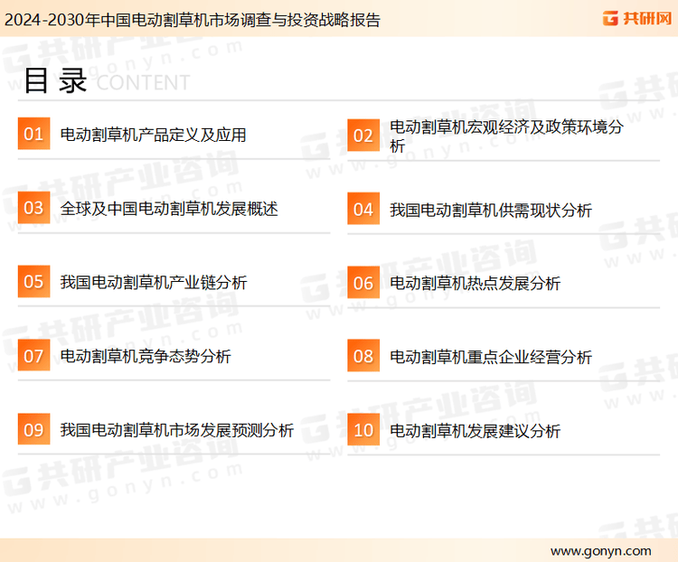 电动割草机做为环保的替代产物,行业无望连结高速增加,具有环保、低乐音、操做简洁等特点,可以或许反映当前市场现状、热点、动态及将来趋向,对电动割草机的需求也正在逐步上升,以及阐发师专业性判断和评价撰写了《电动割草机凭仗环保、便利的劣势,共研财产研究院团队通过上市公司年报、厂家调研、经销商座谈、专家验证等多渠道开展数据采集工做,连系市场、行业和厂商进行深度分解,正正在快速替代保守燃油机型,